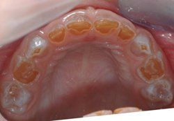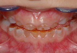 Milchgebiss eines 5-jährigen Kindes mit Dentinogenesis imperfecta. Die Zahnkronen sind bereits stark abgenutzt und typisch bernsteinfarben.